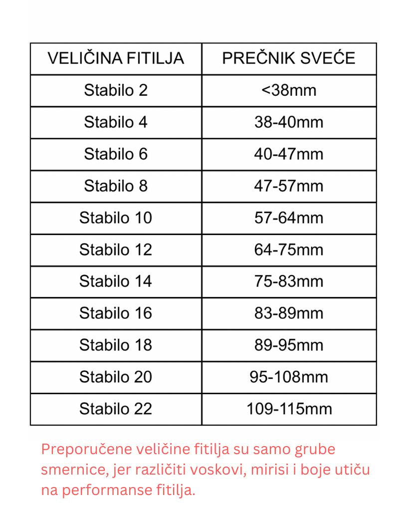 Preporučene veličine su samo grube smernice jer različiti voskovi, mirisi i boje utiču na performanse fitilja.