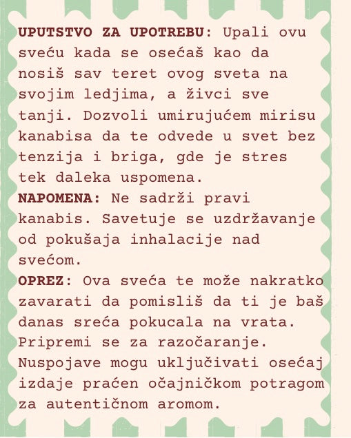 Uz ovu sveću, miris "Kanabisa" vas vodi na mini mentalni odmor - gde je stres stvar prošlosti, a vi ste zen majstor. Samo se opustite... Na kraju krajeva, šta može poći po zlu?